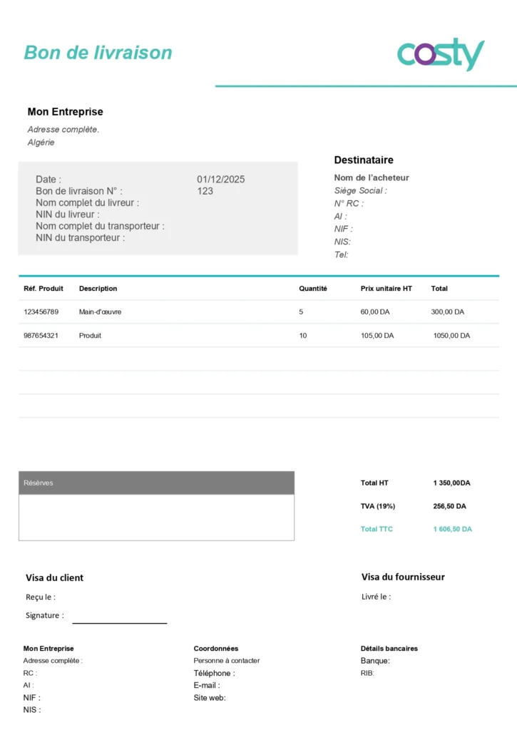 Le modèle présenté ci-dessus inclut toutes les mentions nécessaires adaptés à la législation algérienne: en-tête fournisseur, identité client, numéro et date, détail des articles, quantités, observations et champ signature. Il est conçu pour être clair à la lecture et directement utilisable lors des livraisons.