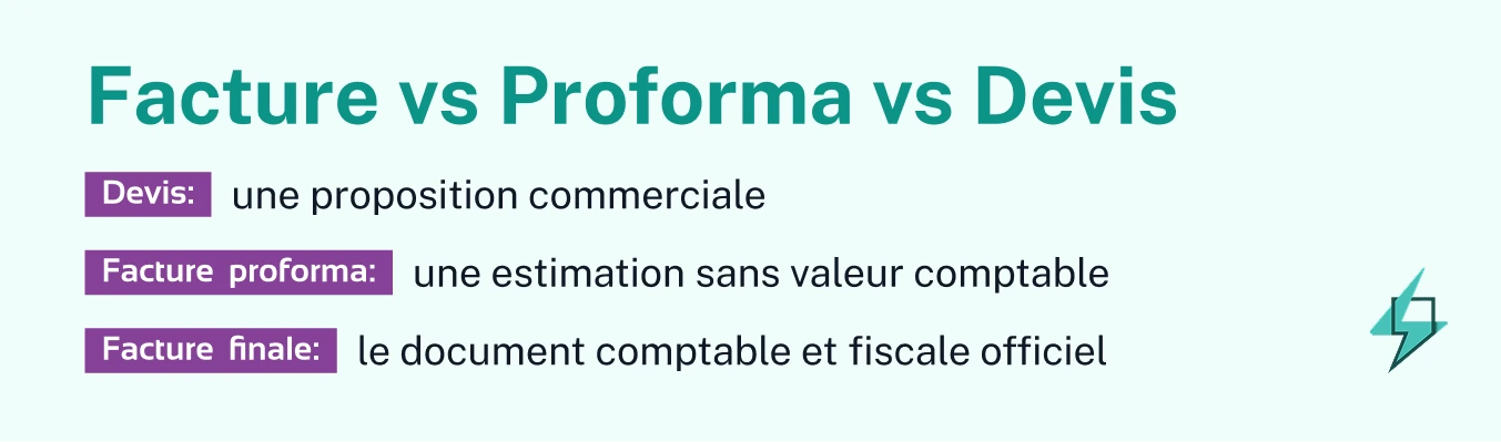 Ces trois documents se ressemblent parfois visuellement, mais leur rôle et leur valeur juridique sont très différents. Les confondre crée des erreurs (paiements tardifs, litiges, problèmes fiscaux). Il est important de savoir quand émettre un devis, une facture proforma ou la facture définitive en Algérie, Voici comment distinguer simplement chacun d’eux: