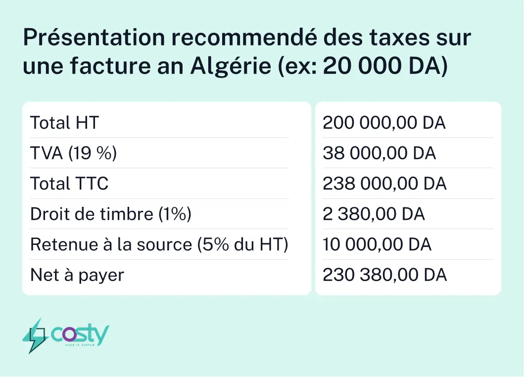 Affichez la devise (DA) et ajoutez une courte note si une retenue ou une exonération s’applique.
