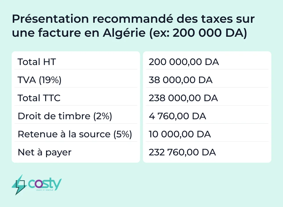 Sur une facture, il faut faire apparaître clairement les éléments qui expliquent comment le montant final est calculé. En Algérie, les informations fiscales visibles et récurrentes sont la TVA (si vous êtes assujetti), d’éventuelles retenues à la source et le droit de timbre. Les autres impôts (IRG, IBS, TAP) relèvent principalement de la déclaration fiscale et n’apparaissent pas systématiquement comme lignes séparées sur la facture.